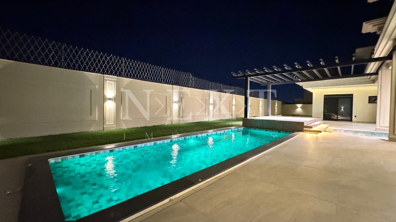 Ao entrar no imóvel você será impactado com uma belo hall de entrada com pé direito amplo seguido da sala de jantar, estar e uma cozinha gourmet com churrasqueira tornando esse ambiente totalmente convidativo para receber amigos ou apenas relaxar em família, esse espaço se integra totalmente com área de lazer que é um verdadeiro oásis, com uma piscina com spa e cascata aérea fazendo desse ambiente o foco central do seu imóvel. A área intima conta com 04 suítes, sendo 01 suíte master com closet e banheiro com duchas e cubas Sr e Sra. Além de todas essas comodidades o imóvel também possui um escritório e lavabo na parte social. O gourmet é um ponto que precisa ser destacado, com um excelente espaço coberto para receber convidados e uma piscina com cascata é o espaço ideal para seu momento de lazer, uma sala de cinema para assistir TV com toda privacidade e conforto.