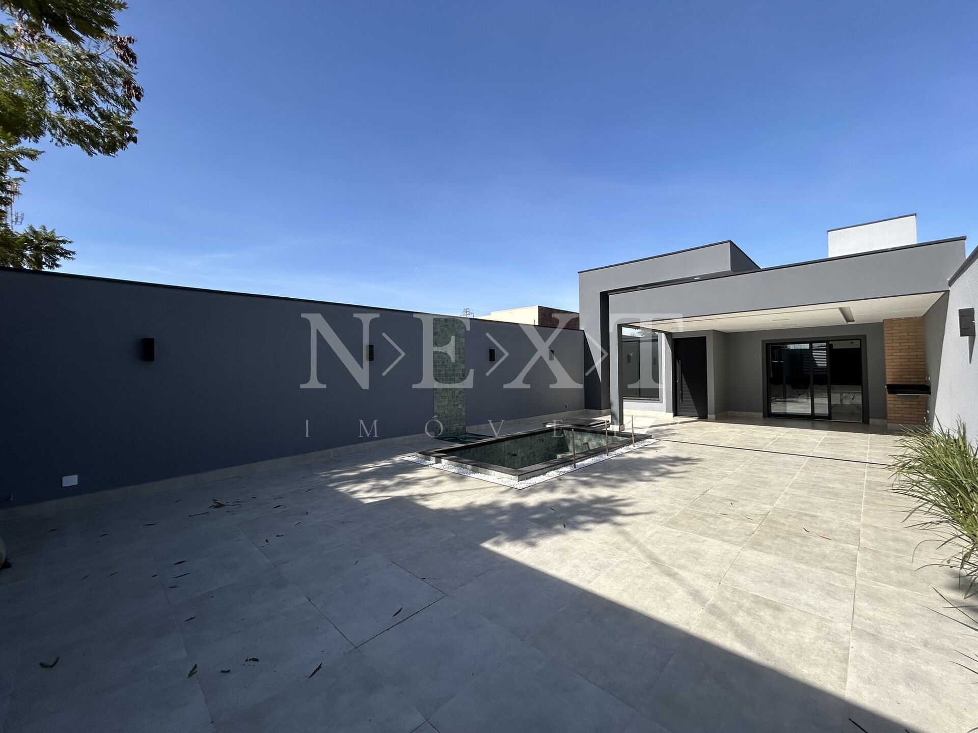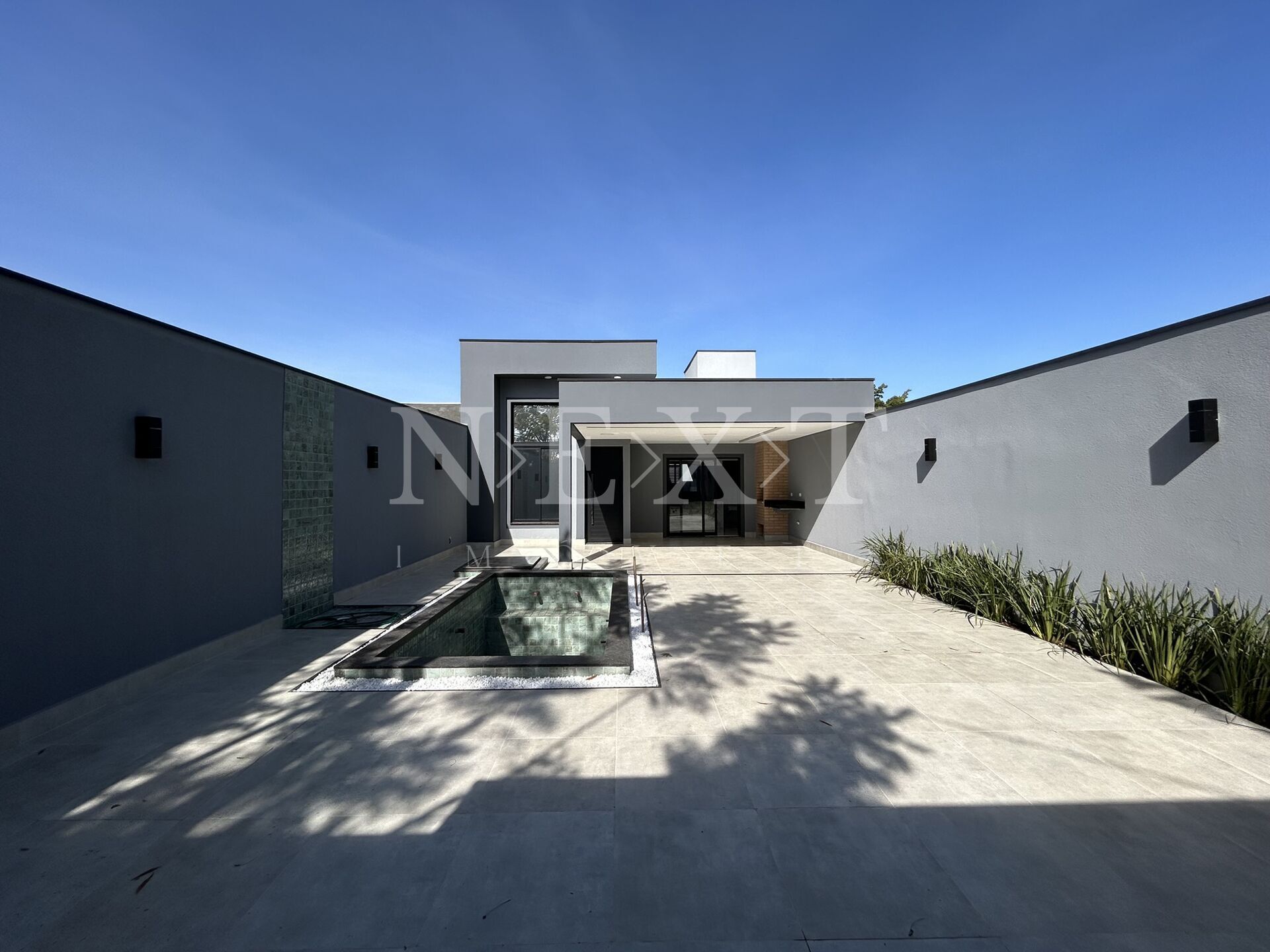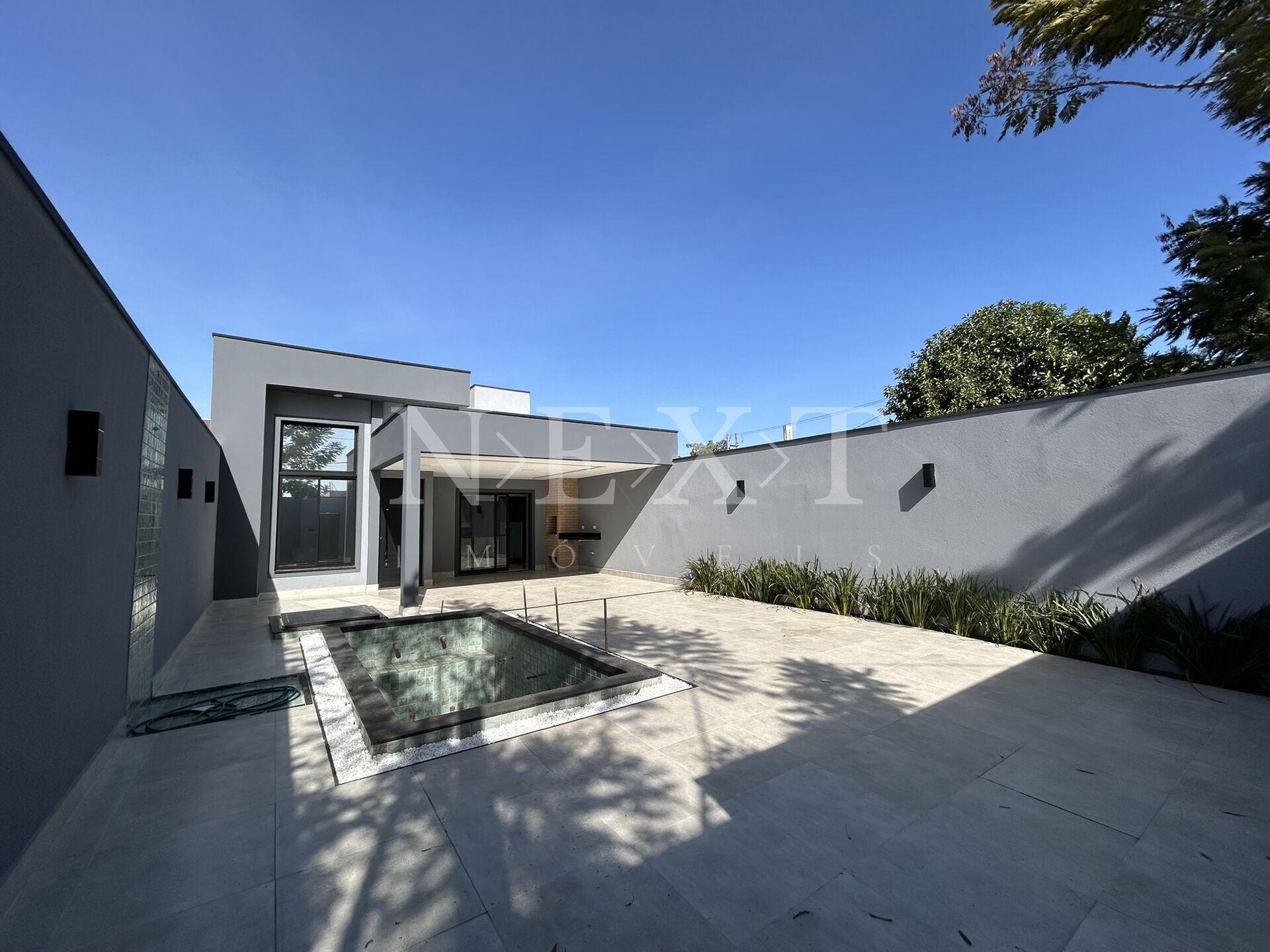 Casa térrea com 3 dormitórios sendo uma suíte, sala com pé direito alto integrada com a sala de jantar, área gourmet com piscina e churrasqueira, garagem para 4 carros, piso todo em porcelanato e portão basculante.
